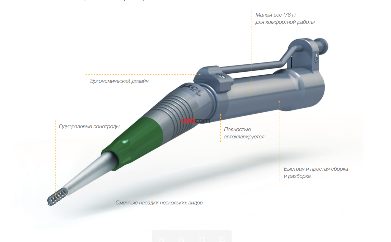 Данный ультразвуковой инструмент для нейрохирургических и спинальных операций на костных тканях с широким набором сменных одноразовых электродов представляет новейшее поколение ультразвуковых инструментов и воплощает в себе преимущества ультразвуковой технологии Söring.